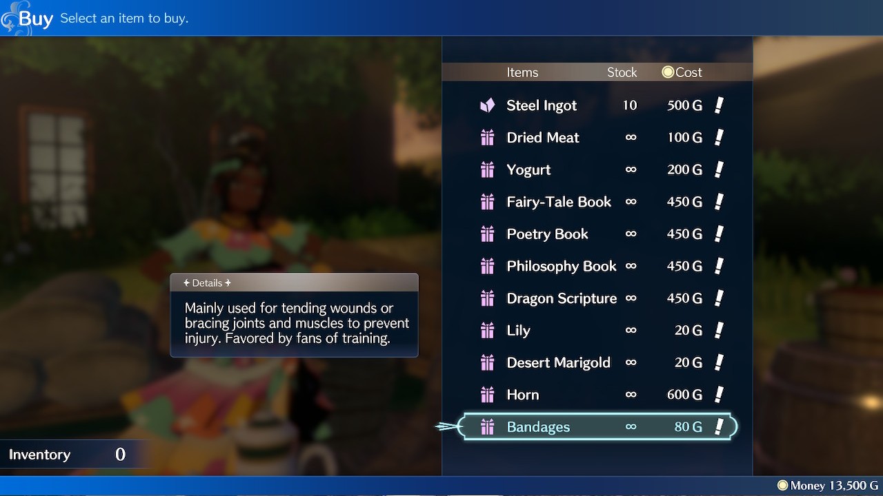 | Alfred | Bandages Dragon Scripture Flower Wreath Horn Lentil Flower Muscle Balm Spirit Gem Strong Perfume Training Weight White Clover | Horse Manure Sewing Kit Sharp Chisel Sheep Wool Spicy Seasonings |