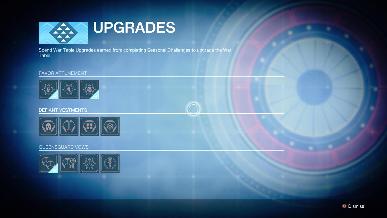 There are three groups of upgrades to choose from at the War Table: Favor Attunement, Defiant Vestments, and Queensguard Vows.