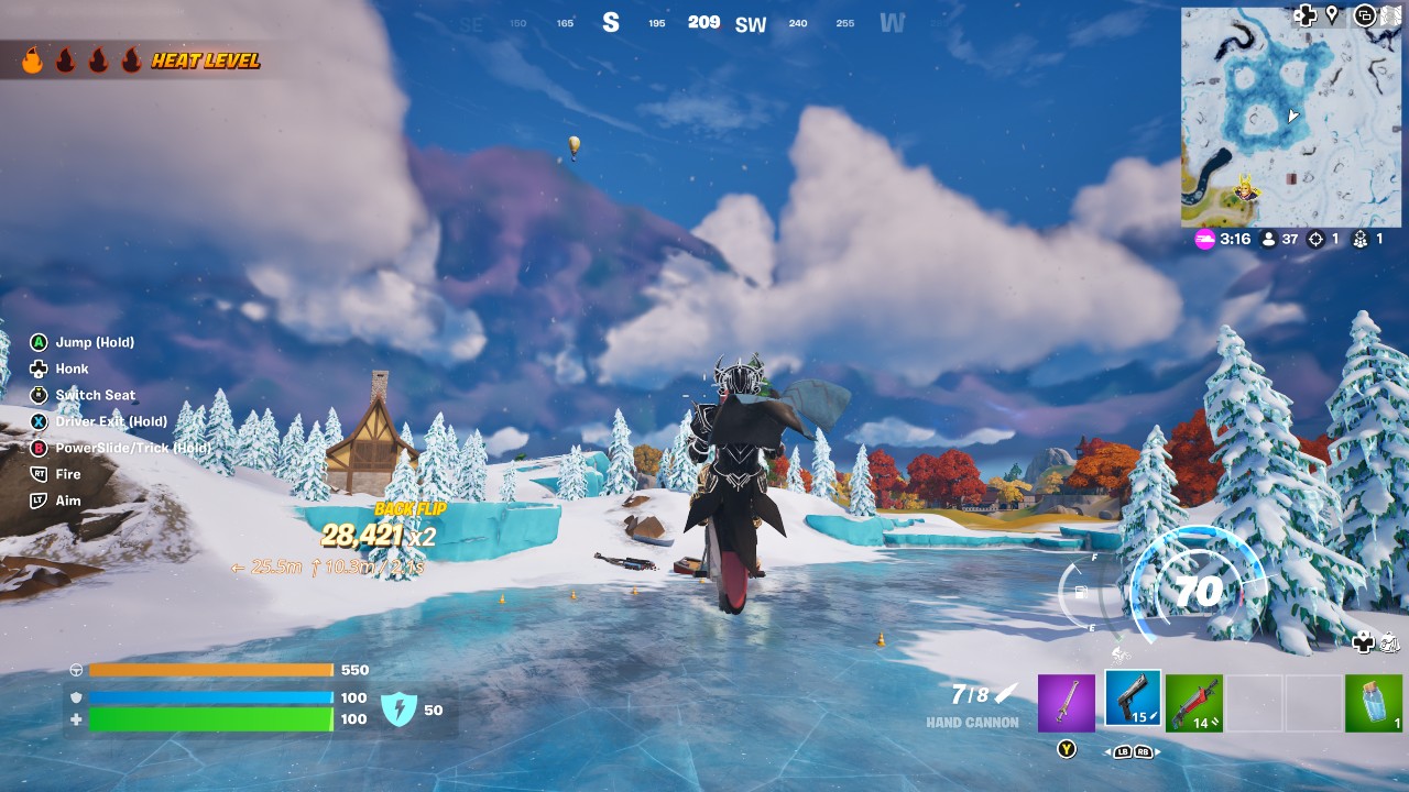 Ensure that the Dirt Bike is straight just before landing, or you’ll lose the points you earned performing your trick. The best way to earn Trick Points in Fortnite is to keep the Jump button held down until you approach a large ramp, then release it as you reach the edge. Push your joystick forward (or keep W held down on PC) and perform as many flips as possible before landing.
