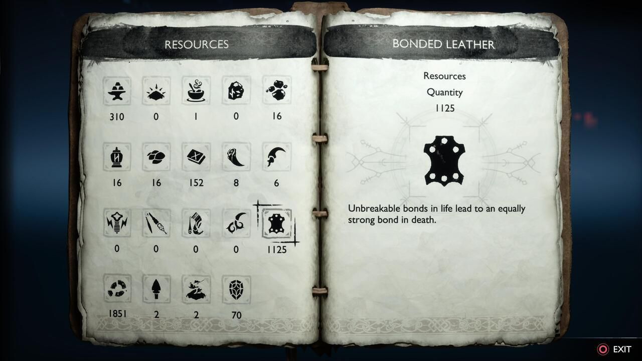 Bonded Leather feels like one of the more common materials in God of War, but unfortunately, it’s not something you will often experience during your exploration. You will need to defeat some of the stronger enemies and minibosses the game offers, such as the Huntress, to acquire Bonded Leather, but luckily your hard work will pay off since Bonded Leather drops in large stacks from enemies. In addition, acquiring Favors will encourage you to stray from the path and slay some of the more intimidating enemies, which makes the process slightly more purposeful than just going out on your own.